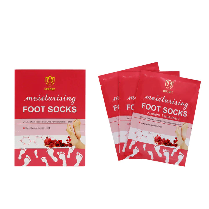 Nombre: Mascarilla exfoliante para pies enriquecido con aceite de flor de rosa y aceite de semilla de granada